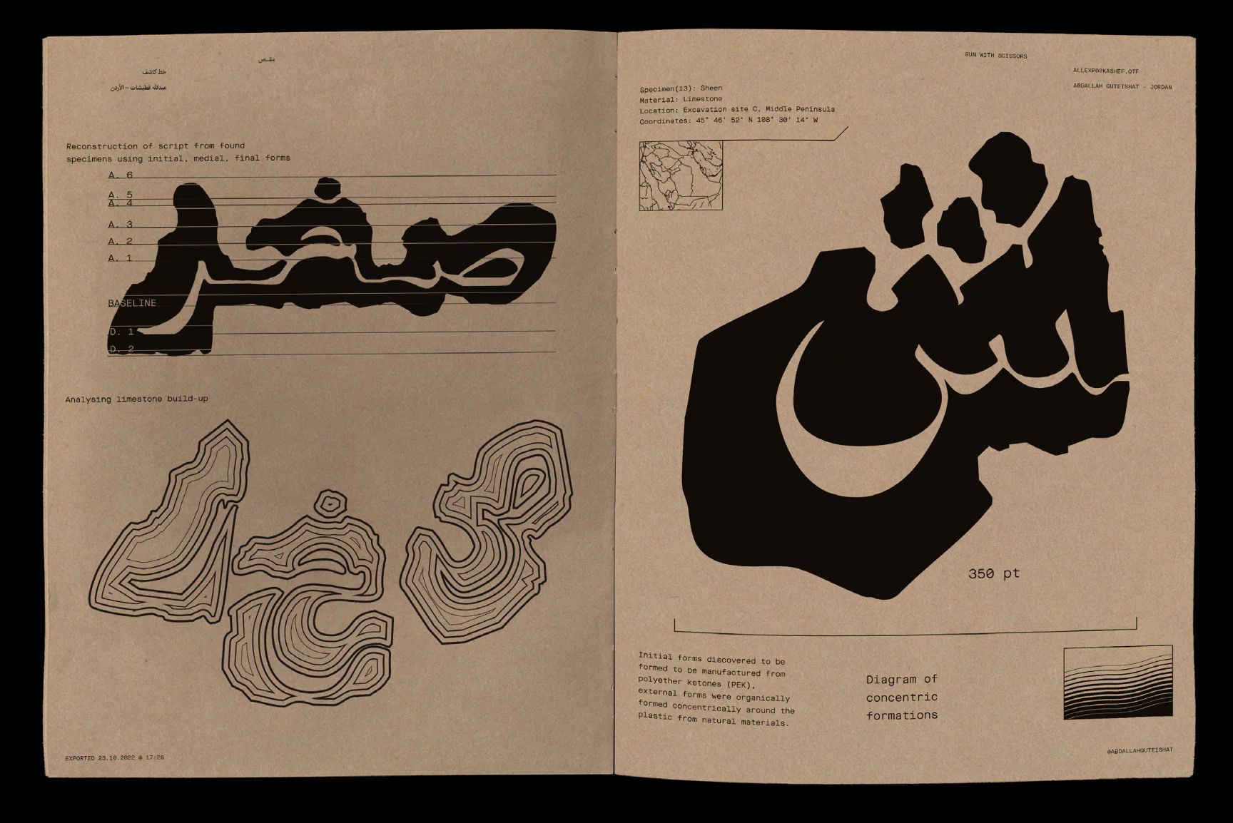 “Set in Stone” captures the journey of our workshop across three phases: Steady as a Rock, On Paper, and Run with Scissors. The book highlights the Arabic letter’s ancestral roots, aesthetic theory, and its role in education and identity. It documents tours, research, and design sessions that led to the creation of 11 experimental Arabic typefaces inspired by ancient scripts, folklore, geology, and more. The book culminates with a showcase at EYEN’s Space in Amman. Published bilingually with unique materials and design, it’s a tribute to Arabic typography—produced in collaboration with ELHARF Publications.
